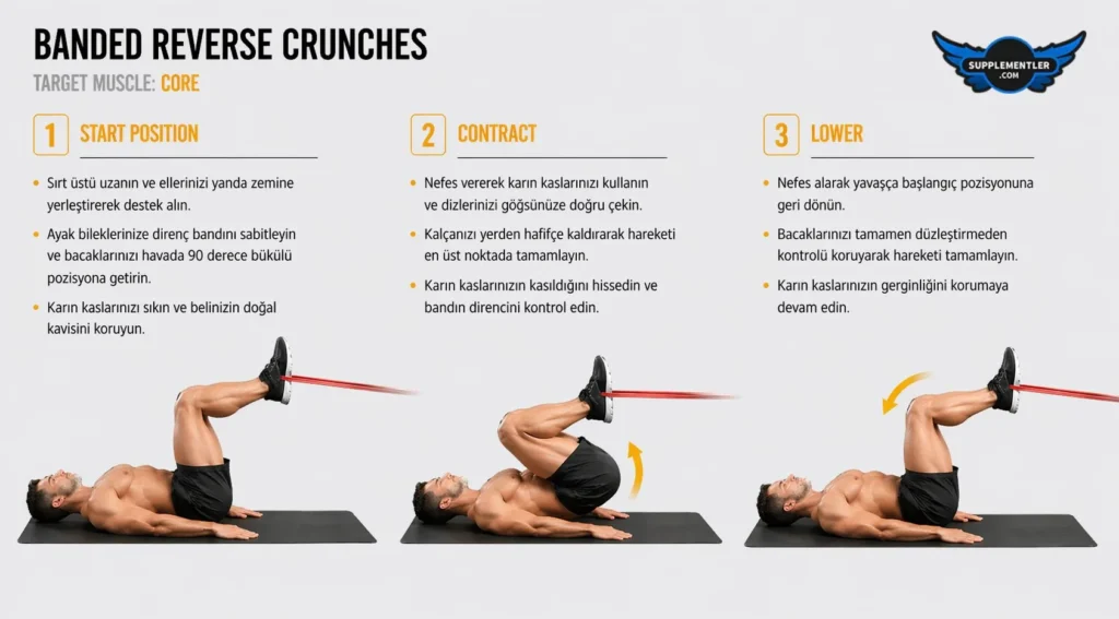 Nasıl Yapılır: Direnç bandının bir ucunu yere yakın sağlam bir noktaya sabitleyin ve diğer ucunu ayaklarınıza (veya bileklerinize) geçirerek sırtüstü uzanın. Kollarınızla yanlardan destek alıp dizlerinizi bükülü pozisyonda tutarken, nefes verip karın kaslarınızı sıkarak dizlerinizi göğsünüze doğru çekin ve bandın sizi aşağı çeken direncine karşı koyarak kalçanızı yerden birkaç santim yukarı doğru yuvarlayın. Tepe noktasında karın kaslarınızı iyice sıkıştırdıktan sonra, bandın bacaklarınızı aniden geri fırlatmasına izin vermeden, hareketi tamamen kendi kas gücünüzle frenleyerek yavaş ve kontrollü bir şekilde bacaklarınızı başlangıç pozisyonuna geri indirin.