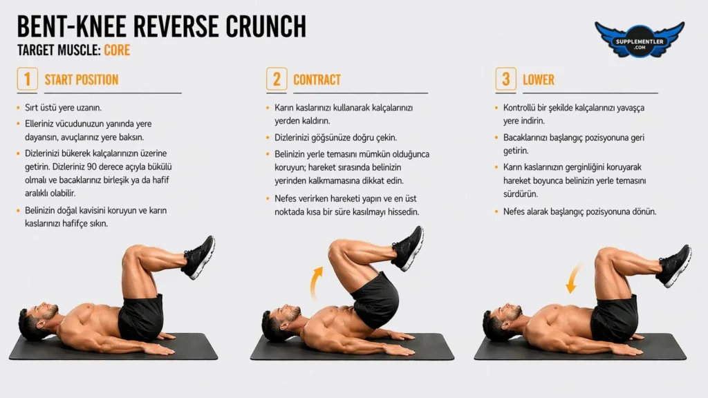 Reverse crunch, alt karın kaslarını odak noktasına alan ve core bölgesini genel olarak güçlendiren etkili bir egzersizdir. Pelvisin (leğen kemiği) göğüs kafesine doğru yuvarlanmasıyla birlikte karın kaslarını aşağıdan yukarıya doğru çalıştırır. Düzenli uygulandığında karın kaslarının sıkılaşmasına, duruşun iyileşmesine ve core stabilitesinin artmasına katkı sağlar.