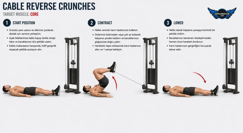 Nasıl Yapılır: Kablo makinesinin alt makarasına bir ayak bilekliği (ankle strap) takıp ayaklarınıza geçirin ve makine ile aranızda yeterli mesafe bırakarak sırtüstü uzanın. Kollarınızla yanlardan veya başınızın arkasındaki sabit bir noktadan destek alırken, nefes verip karın kaslarınızı sıkarak dizlerinizi göğsünüze doğru çekin ve kablonun sağladığı sürekli dirence karşı koyarak kalçanızı yerden birkaç santim yukarı doğru yuvarlayın. Tepe noktasında karın kaslarınızı maksimum seviyede sıkıştırdıktan sonra, makinenin bacaklarınızı aniden geri çekmesine izin vermeden ve ağırlık plakalarının birbirine çarpmasını engelleyerek, yavaş ve kontrollü bir şekilde kalçanızı başlangıç pozisyonuna geri indirin.