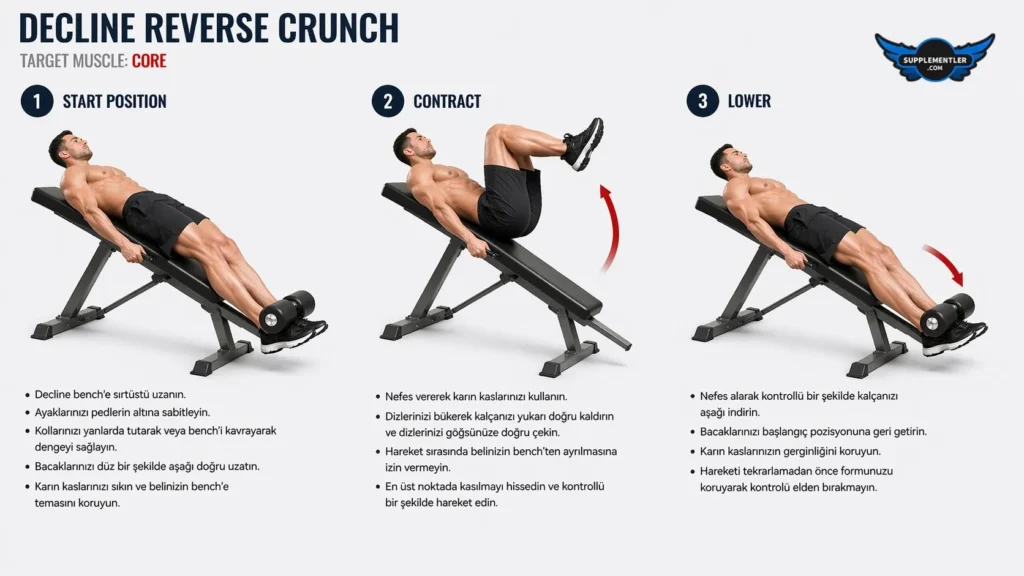 Nasıl Yapılır: Eğimli bir mekik sehpasına (decline bench) başınız yukarıda kalacak şekilde sırtüstü yatıp ellerinizle başınızın arkasındaki barlardan veya sehpanın kenarlarından sıkıca tutunun. Dizlerinizi bükerek ayaklarınızı havaya kaldırın; nefes verirken karın kaslarınızı sıkarak dizlerinizi göğsünüze doğru çekin ve yerçekimine karşı koyarak kalçanızı sehpadan yukarı doğru yuvarlayıp kaldırın. Tepe noktasında karın kaslarınızı iyice sıkıştırdıktan sonra, yerçekiminin bacaklarınızı hızla aşağı çekmesine izin vermeden, tüm gerilimi karın kaslarınızda hissederek yavaş ve kontrollü bir şekilde kalçanızı başlangıç pozisyonuna geri indirin.