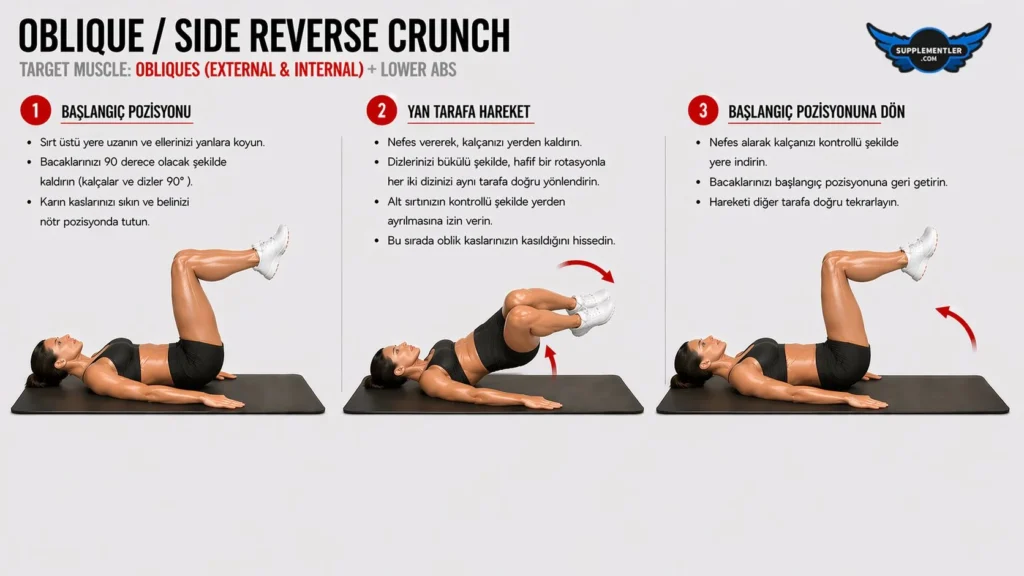 Nasıl Yapılır: Sırtüstü uzanıp kollarınızla yanlardan destek alın ve dizlerinizi bükerek bacaklarınızı havaya kaldırın. Nefes verirken karın kaslarınızı sıkarak dizlerinizi göğsünüze doğru çekin, ancak standart versiyondan farklı olarak kalçanızı yerden yuvarlayarak kaldırırken gövdenizin üst kısmını sabit tutarak pelvisinizi hafifçe çevirin ve dizlerinizi sağ veya sol omzunuza doğru yönlendirin. Tepe noktasında yan karın (oblik) kaslarınızı iyice sıkıştırdıktan sonra, hareketin kontrolünü kaybetmeden ve bacaklarınızı yere düşürmeden kalçanızı yavaşça başlangıç pozisyonuna (merkeze) geri indirin ve bir sonraki tekrarda dizlerinizi diğer tarafa doğru çevirerek sağ ve sol yan karın kaslarınızı sırayla çalıştırın.