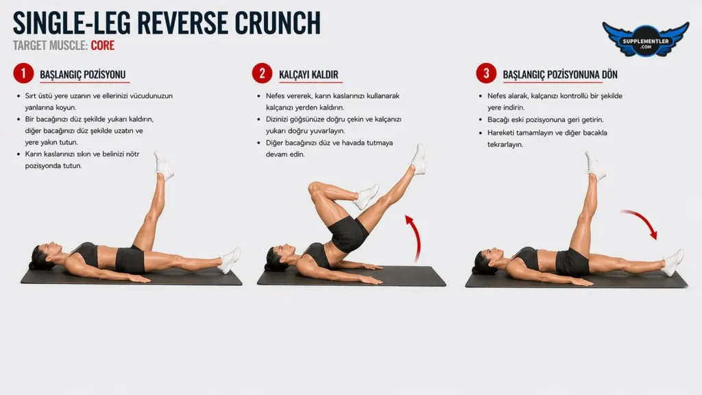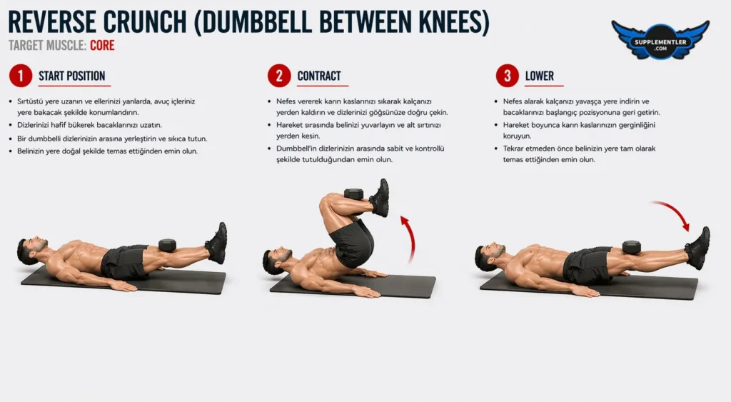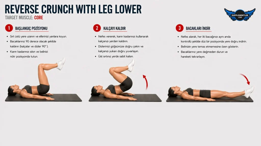 Reverse crunch hareketinin kontrollü uygulanması, karın kaslarının aktif tutulması ve belin zorlanmaması önemlidir.