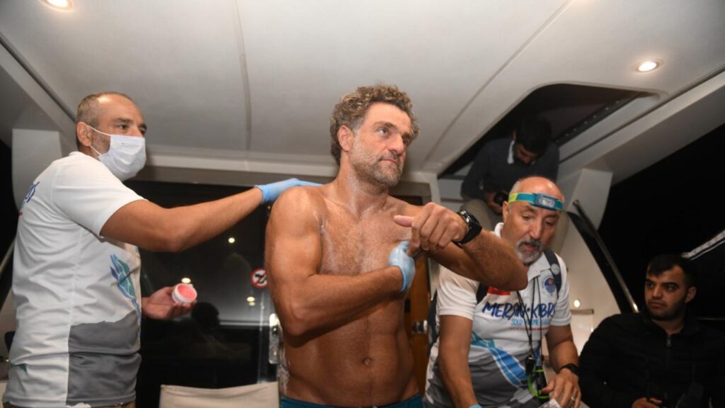 “Geçen sene 2 Ekim’de Mersin Yenişehir Belediyesi sponsorluğunda bir denememiz oldu. Önümde bunu yapmış bir kişi bile olmadığı için parametrem yok. Örneğin “Emre 20. Saatte sana şu olacak sabret.” Veya “Şu merhemi kullan şu ilacı iç.” Bunun gibi bir şey yok. O sebeple bazı şeyleri deneme yanılma yoluyla öğreniyoruz. 2 Ekim 2020’de geçiş için suya girdik. Bir dizi aksilikler silsilesi yaşandı. Ama bu benim için çok iyi bir ders oldu. Antrenmanlarımın yetersiz değil ama verimsiz olduğunu anladım. Aksiliklerden kastım şuydu: Zodyak çalışmadı, bu tür ultra maraton geçişlerde suya yakın bir deniz aracının beni takip etmesi lazım. Beni üç katlı koskoca bir yat takip etti. Dolayısıyla rüzgarın ve akıntının hızıyla yat hemen yön değiştirdi. Yüzücü o kadar kolay yön değiştiremiyor ama yüzen büyük cisim çok rahat bir şekilde rüzgardan etkilenebiliyor.”
